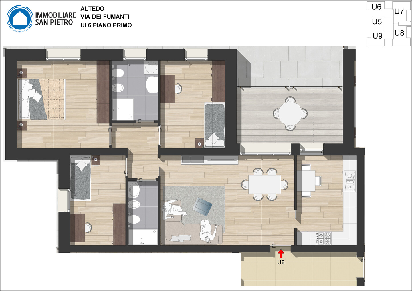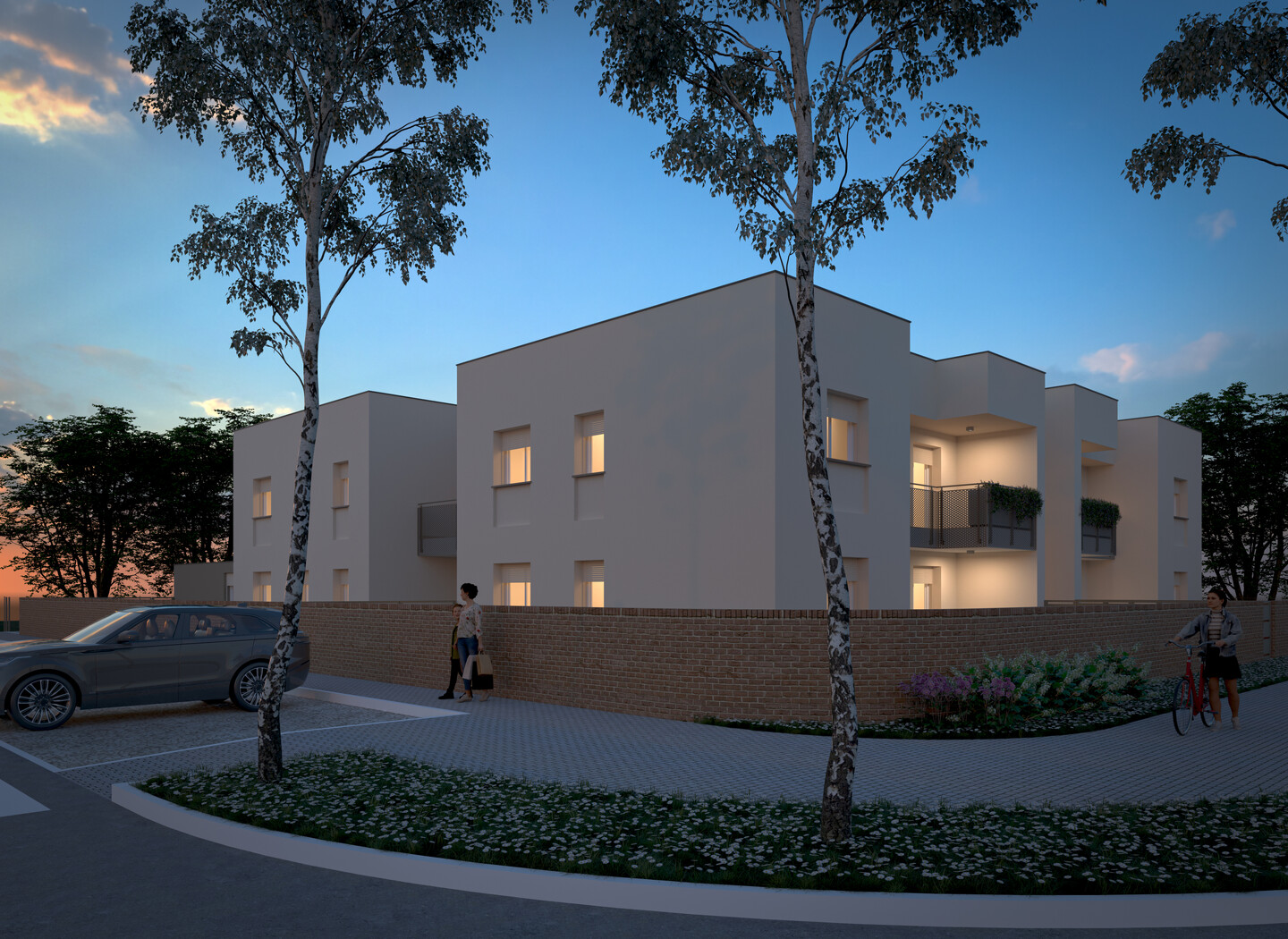 L’intervento in oggetto consiste nella realizzazione di una palazzina sviluppata su 2 livelli di ultima generazione. L’appartamento numero 6 è interamente sviluppato al primo piano e così strutturato: ingresso su soggiorno, cucina abitabile (dai quali è possibile accedere direttamente al terrazzo), una camera matrimoniale, una camere doppia, una camera singola e 2 bagni. Completano la proprietà un’autorimessa e, volendo, una cantina a parte su richiesta. Sono infine presenti 4,5 kW di impianto fotovoltaico per ogni appartamento.