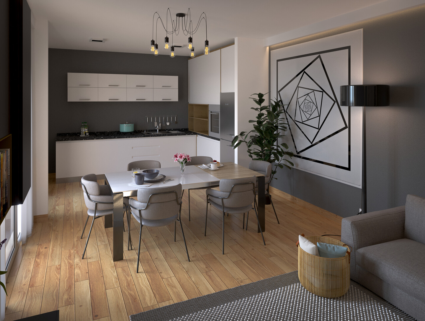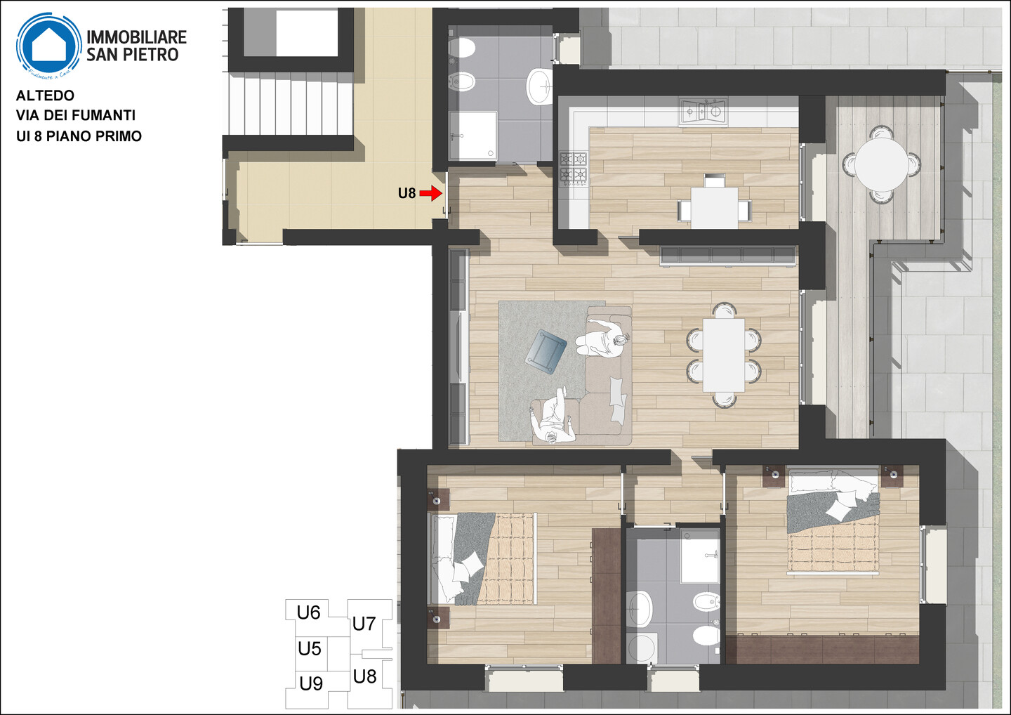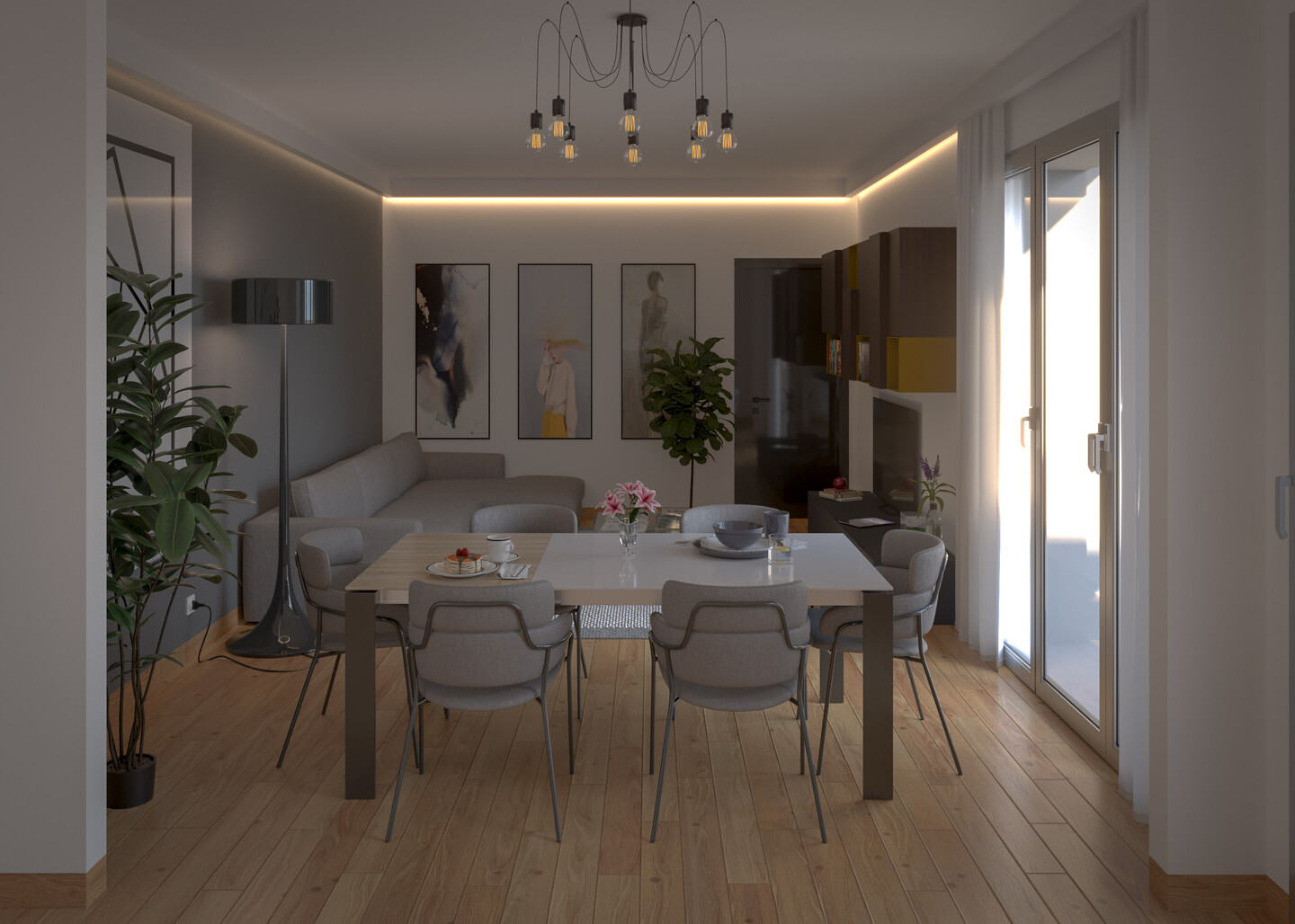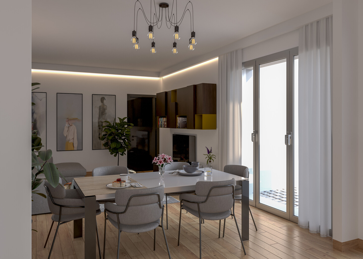 L’intervento in oggetto consiste nella realizzazione di una palazzina sviluppata su 2 livelli di ultima generazione. L’appartamento in questione è interamente sviluppato al primo piano e così strutturato: ingresso su un piccolo disimpegno, soggiorno, cucina abitabile (dai quali è possibile accedere direttamente al terrazzo), 2 camere matrimoniali e 2 bagni. Completano la proprietà un’autorimessa e, volendo, una cantina a parte su richiesta. Sono infine presenti 4,5 kW di impianto fotovoltaico per ogni appartamento.