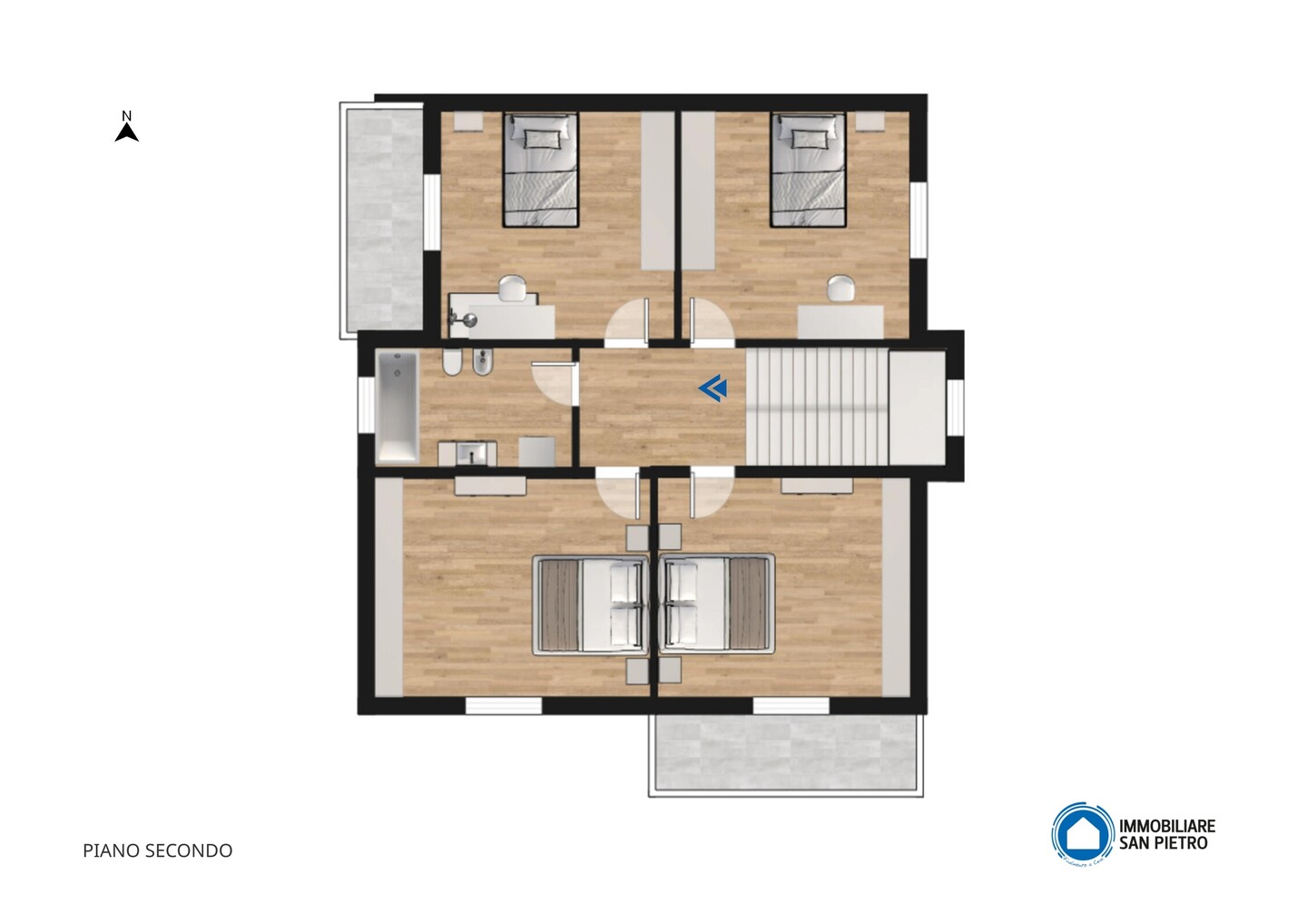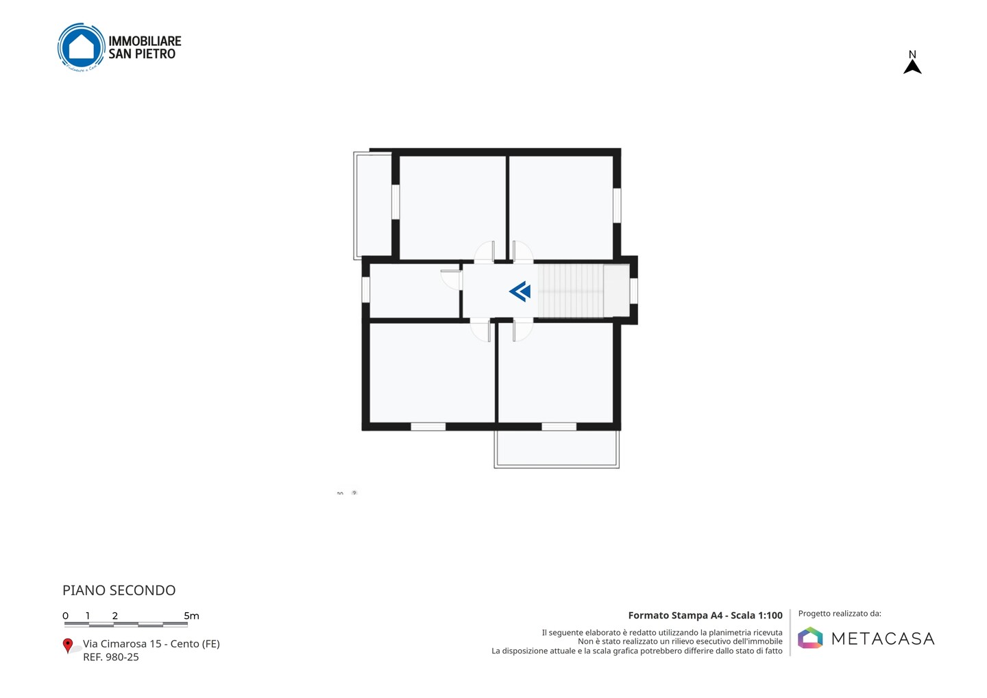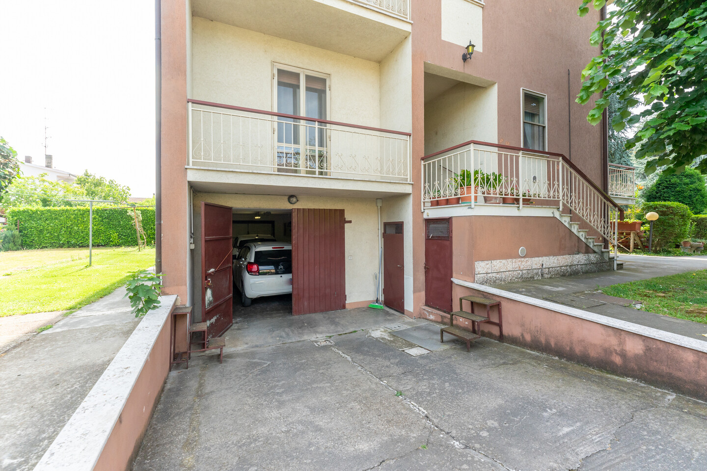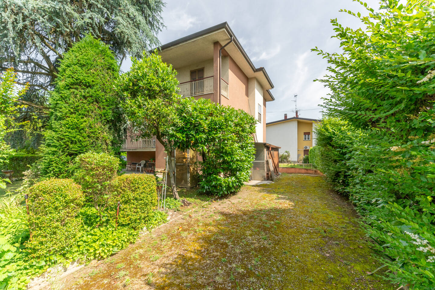Casa indipendente sviluppata su tre livelli: al piano seminterrato troviamo i vani accessori quali cantina, lavanderia, garage, wc e locale tecnico; al piano primo, accessibile sia da scala interna che esterna, troviamo una cucina abitabile con accesso al balcone, soggiorno, camera con balcone, ripostiglio e bagno; al piano secondo abbiamo 4 camere da letto di cui due con accesso al balcone e bagno. A completare la proprietà un giardino privato di 600mq sviluppato su tutti e quattro i lati dell’immobile.