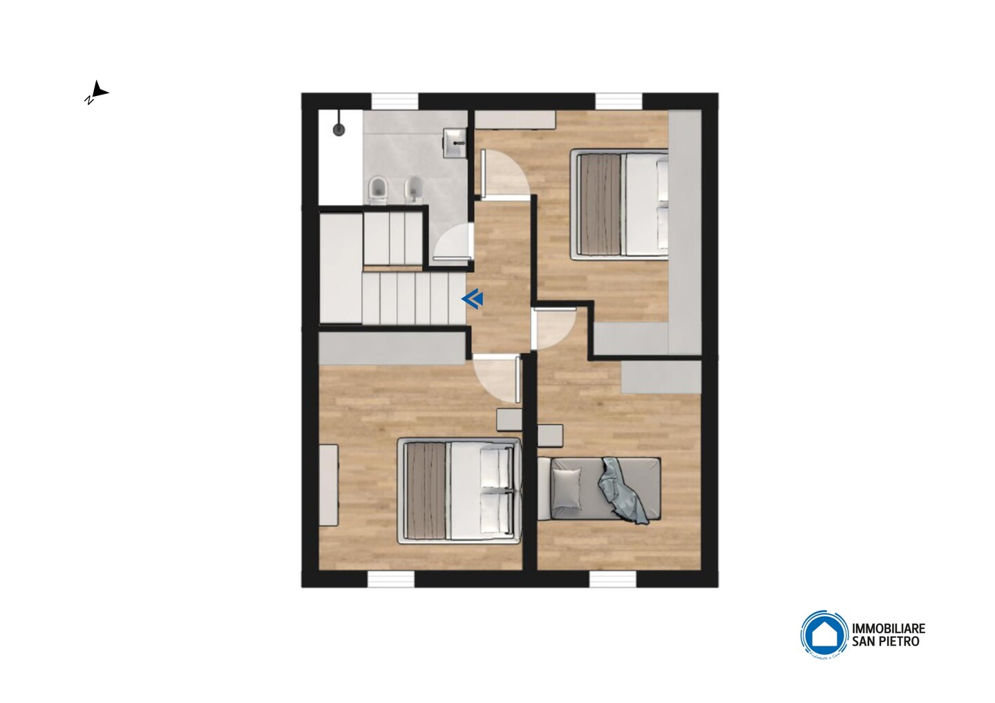 Villetta a schiera, porzione centrale, composta da: ingresso su giardino con posto auto, internamente soggiorno, cucina, sala da pranzo, bagno ed ulteriore porzione di giardino sul retro. Scala che porta al piano primo dove sono presenti 3 camere da letto ed un bagno.