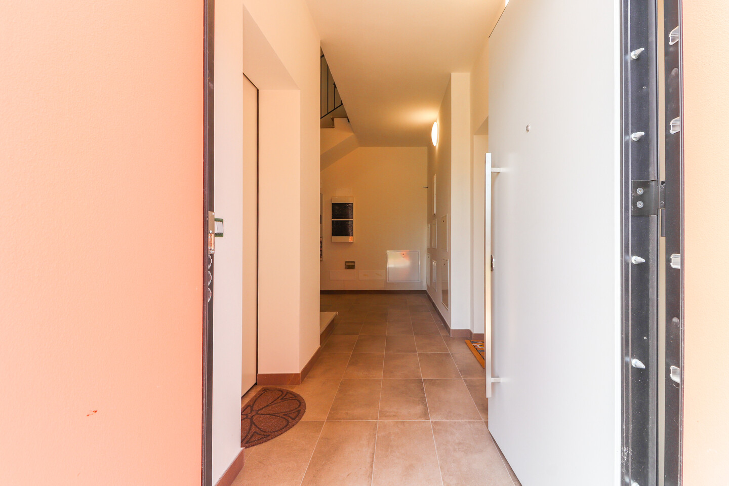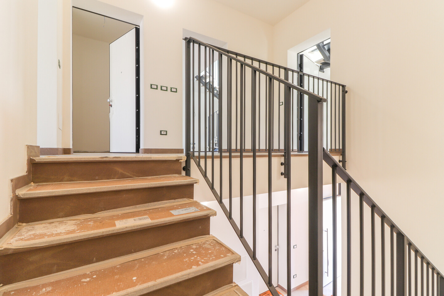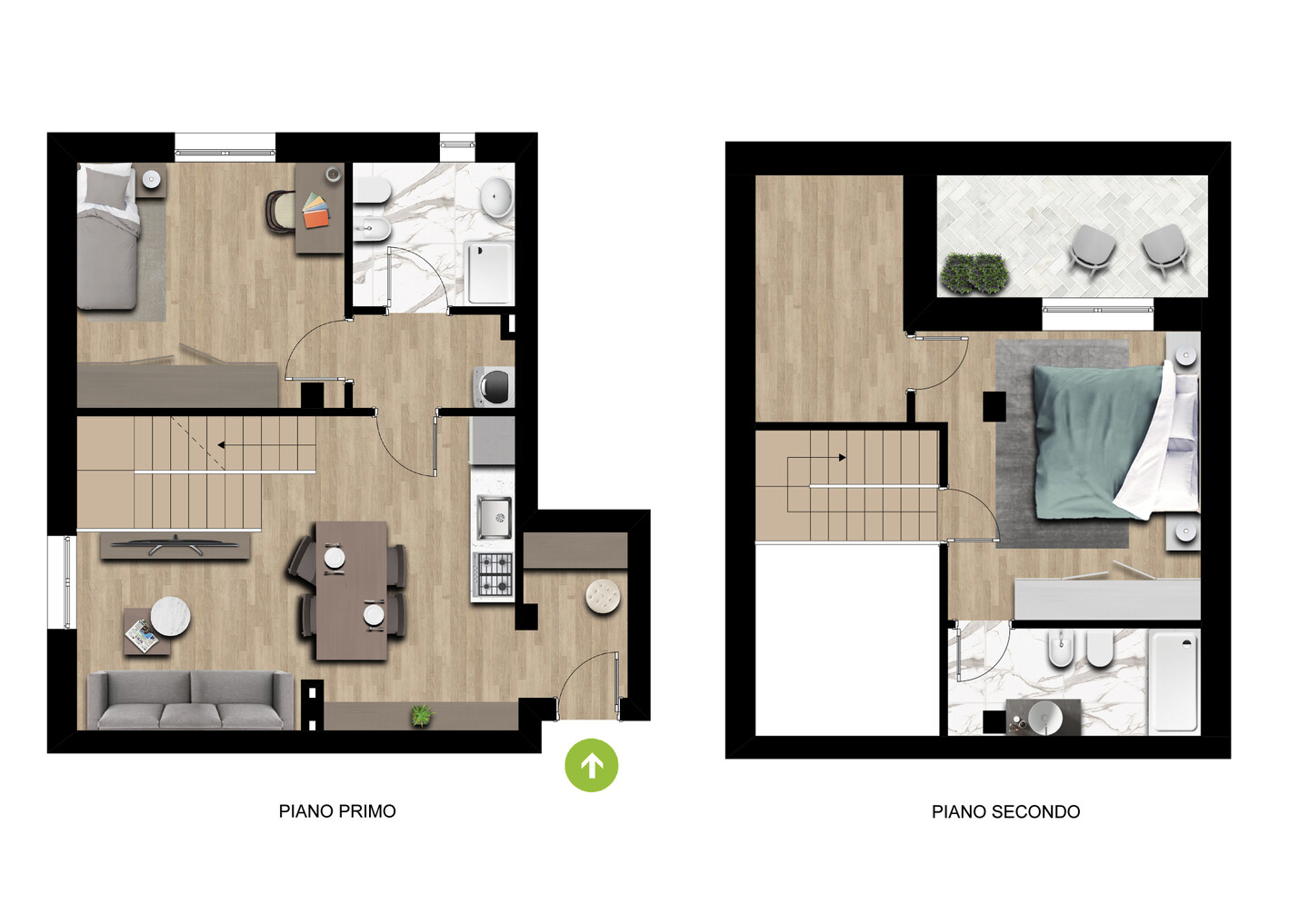 Appartamento nuovo da impresa, su due livelli in doppio volume caratterizzato da travi in legno bianche a vista. Al primo piano è presente la zona living con cucina, camera e bagno; al secondo piano, collegato da una scala di design, troviamo la camera matrimoniale con bagno e terrazzo abitabile. Classe energetica A4, con tecnologia a emissioni zero: pompa di calore, ventilazione meccanica controllata e pannelli fotovoltaici, riscaldamento e raffrescamento a pavimento con gestione autonoma. Finiture di pregio: gres porcellanato effetto legno e cemento spazzolato, servizi completi di sanitari e rubinetterie di alto livello. Completano la proprietà comodi posti auto esterni. APP.E